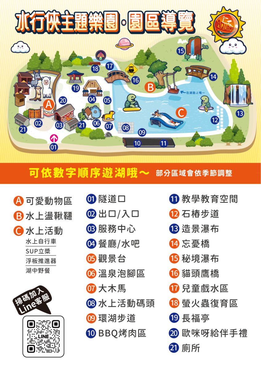 - 小提醒:園區禁止車輛進入與炊煮、戲水、餵食等行為,屬步行空間;若攜帶寵物需繫繩或放籠,並隨手清理排泄物,維護良好環境。